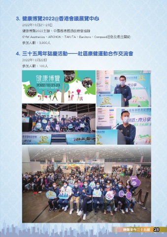 3. 健康博覽2022@香港會議展覽中心 2022年10月21—23日 健康博覽2022主辦、中國香港體適能總會協辦 GYM Aesthetics、ARCHON、TANITA、Banitore、Compeed活動及產品贊助 參加人數:3,000人 4. 三十五周年誌慶活動—社區康健運動合作交流會 2022年10月22日 參加人數:100人 28 創會至今三十五載 28