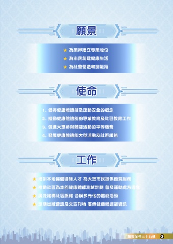 願景 願景 ⭐ 為業界建立專業地位 ⭐ 為市民創建健康生活 ⭐ 為社會營造和諧氣氛 使命 使命 1. 倡導健康體適能及運動安全的概念 2. 推動健康體適能的專業教育及社區教育工作 3. 促進大眾參與體能活動的平等機會 4. 發展健康體適能大型活動及社區服務 工作 工作 ⭐ 培訓本地健體導師人才 為大眾市民提供優質服務 ⭐ 推動社區為本的健康體能測試計劃 普及運動處方理念 ⭐ 廣泛建構社區脈絡 合辦多元化的體能活動 ⭐ 定期出版會訊及文宣刊物 廣傳健康體適能資訊 創會至今三十五載 2 2