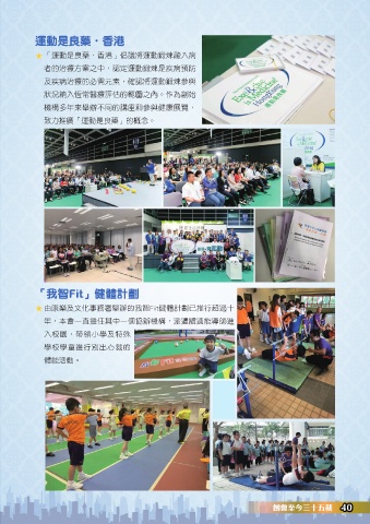 運動是良藥‧香港 ⭐ 「運動是良藥.香港」倡議將運動鍛煉融入病 者的治療方案之中,認定運動鍛煉是疾病預防 及疾病治療的必需元素,確認將運動鍛煉參與 狀況納入恆常醫療評估的範圍之內。作為創始 機構多年來舉辦不同的講座和參與健康展覽, 致力推廣「運動是良藥」的概念。 「我智Fit」健體計劃 ⭐ 由康樂及文化事務署舉辦的我智Fit健體計劃已推行超過十 年,本會一直擔任其中一個協辦機構,派遣體適能導師進 入校園,帶領小學及特殊 學校學童進行別出心裁的 體能活動。 40 創會至今三十五載 40