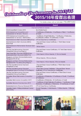 Hong Kong Math Olympiad (OPEN) & Asia 1 Gold Award, 9 Silver Awards, 21 Bronze Awards