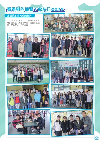 看得到的連繫:校友日2019 王偉民主任 方欣欣老師 2019年1月26日,三百多位校友、 老師及家長又再聚首一堂,緬懷校園歲 月,互勵互勉,好不溫馨! 29