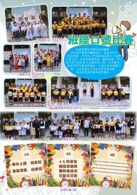 班際口號比賽 ڋॴଡ଼ڌစP.1ʿP.2 為提高學生對學校的歸屬感, 並加強同學間的團隊精神,營造自律守 規的氛圍,本學年上學期訓輔組舉行了班際 口號比賽。各班別發揮所長,盡展所能,齊心 協力創作配合是次主題的班口號。於早會時, 各班同學用響亮的聲線、合拍的動作演繹口 號,大家都盡全力為自己班爭取榮耀, 各班的表現都值得老師讚揚。 ʕॴଡ଼ڌစP.3ʿP.4 ৷ॴଡ଼ڌစ (P.5ʿP.6) ᆤफй 12 ଡ଼ڿࠏɹ