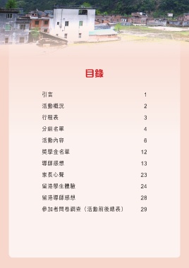 目錄 引言 1 活動概況 2 行程表 3 分組名單 4 活動內容 6 獎學金名單 12 導師感想 13 家長心聲 23 留港學生體驗 24 留港導師感想 28 參加者問卷調查(活動前後總表) 29
