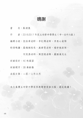鳴謝 書 名:點滴集 作 者:2016-2017 年度五旬節中學學生﹙中一至中六級﹚ 編輯小組:陸詠章老師、李紅輝老師、李惠心老師 特別鳴謝:羅錦城校長、高綺雯老師、楊舒翹老師、 何美燕老師、陳茵妮老師、嚴勛達先生 封面設計:4C 林穎茵 封面題字:2B 麥裕勤 出版日期:二零一七年六月 本文集獲五旬節中學家長教師會資助出版,謹此致謝! 68