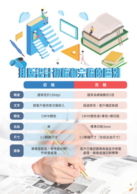 初 稿 完 稿 精度 通常低於150dpi 通常為網線數的2倍 文字 按客戶提供原文稿排入 經過修改,客戶確認無誤 顏色 CMYK顏色 CMYK顏色或+專色+模切版 出血 無 標準印刷3mm 尺寸 1:1精確尺寸 1:1精確尺寸(包括出血尺寸) 解像度較低,有待設計師 客戶已確認圖像無誤並作修圖 圖像 作修圖處理 處理,解像度達印刷標準 10