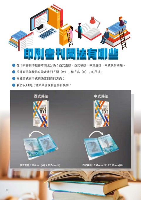 在印刷書刊時把書本開法分為:西式直排、西式橫排、中式直排、中式橫排四類。 根據直排與橫排來決定書刊「闊(W)」和「高(H)」的尺寸; 根據西式與中式來決定翻頁的方向; 我們以A4的尺寸來舉例講解直排和橫排: 西式直排:210mm (W) X 297mm(H) 西式橫排:297mm (W) X 210mm(H) 11
