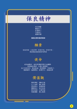 保良精神 相互尊重 團結合力 延展愛心 行善助人 感恩知德 造福社群的奉獻精神 願景 幼有所育,少有所學,壯有所為,老有所依, 貧寡孤困殘病者皆有所望 使命 成為最傑出、最具承擔的慈善公益機構, 發揮保良精神,以善心建善業, 致力保赤安良,護老扶弱,助貧健診,培德育才, 揚康樂眾,實踐環保,承傳文化,造福社群 價值觀 秉承傳統 與時並進 以人為本 關心感恩 優良管治 務實創新 廉潔奉公 安不忘危 善用資源 注重本益 專業團隊 愛心服務 3